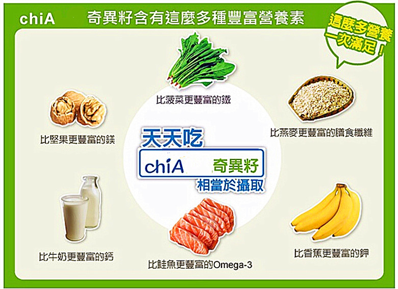 奇亞籽的Omega 3含量是鮭魚的7倍, 鈣含量是牛奶的5倍